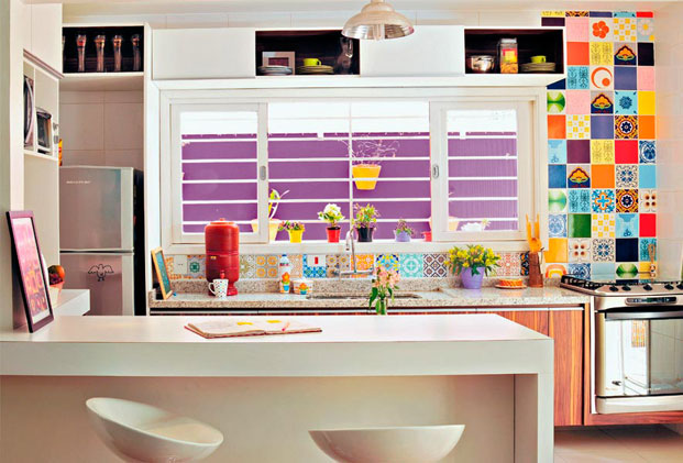 4/30 O mosaico de azulejos é uma solução em conta para fugir do lugar-comum. Faixas de adesivos – coloridas sobre o refrigerador e brancas sobre os móveis de madeira- customizam o ambiente. Tinta com efeito lousa completa a parede. Projeto de Fábio Galeazzo. (Reprodução/Casa.com.br)
