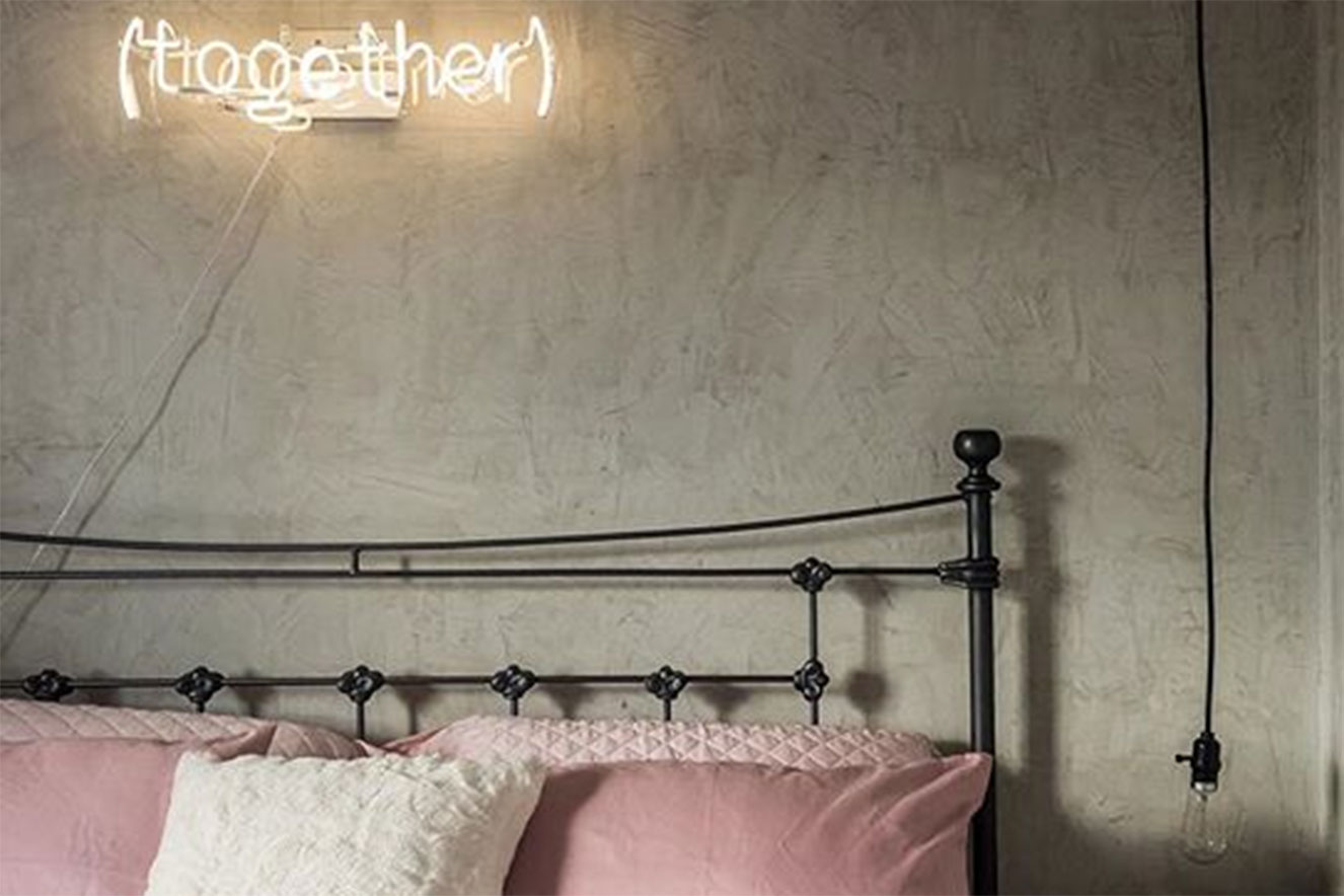 Muito popular principalmente nos perfis do Instagram sobre decoração, uma luminária neon funciona muito bem para o quarto. A maneira que a rede social mais gosta de usar esse tipo de decoração é sobre a cama – e a escolha de cor varia muito: desde o tradicional branco até azul e rosa.