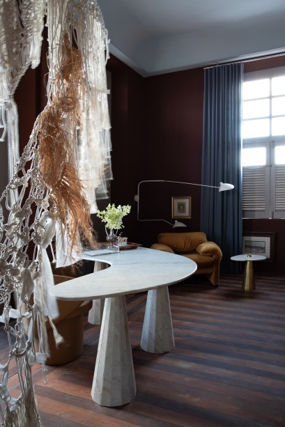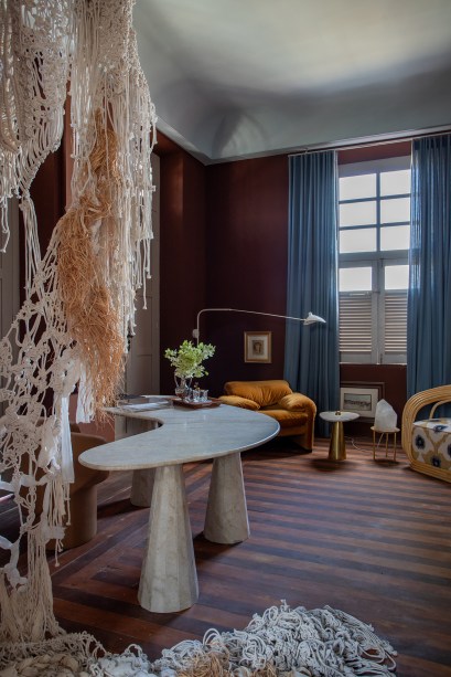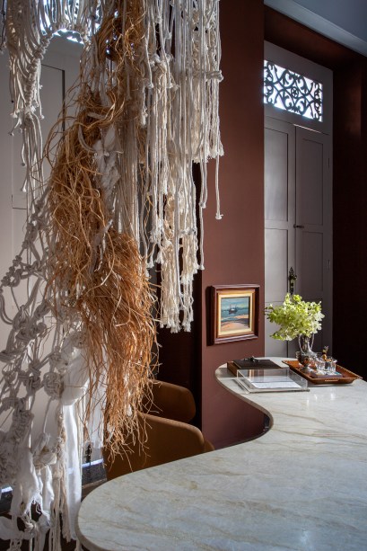 O ambiente traz o azul, que representa o mar e o céu, e o marrom que remete à raiz, segurança e personalidade. “A escultura feita com nós de marinheiro se assemelha ao sargaço, às algas, à espuma do oceano ou uma rede de pesca, trazendo para o espaço uma instalação artística”, conta a profissional.