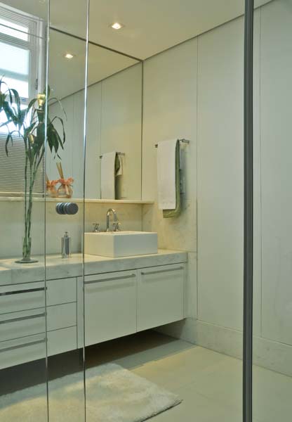 A dica ao colocar armários em banheiros pequenos é fazê-los suspensos, garantindo, assim, a sensação de amplitude. Atente-se também para o material, por ser um ambiente úmido, ele precisa ser resistente ou você terá uma peça danificada em pouco tempo.