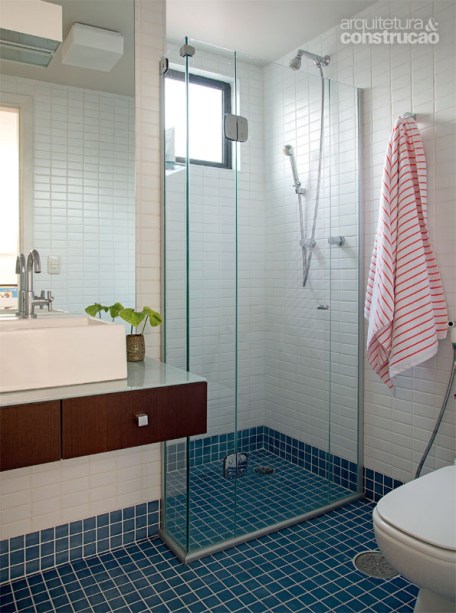 Ao escolher o material, dê prioridade para aqueles que seguem o mesmo estilo que o da casa. Uma outra dica é optar por portas de correr, para otimizar o espaço e por materiais transparentes ou reflexivos, como espelhos, que dão sensação de amplitude.