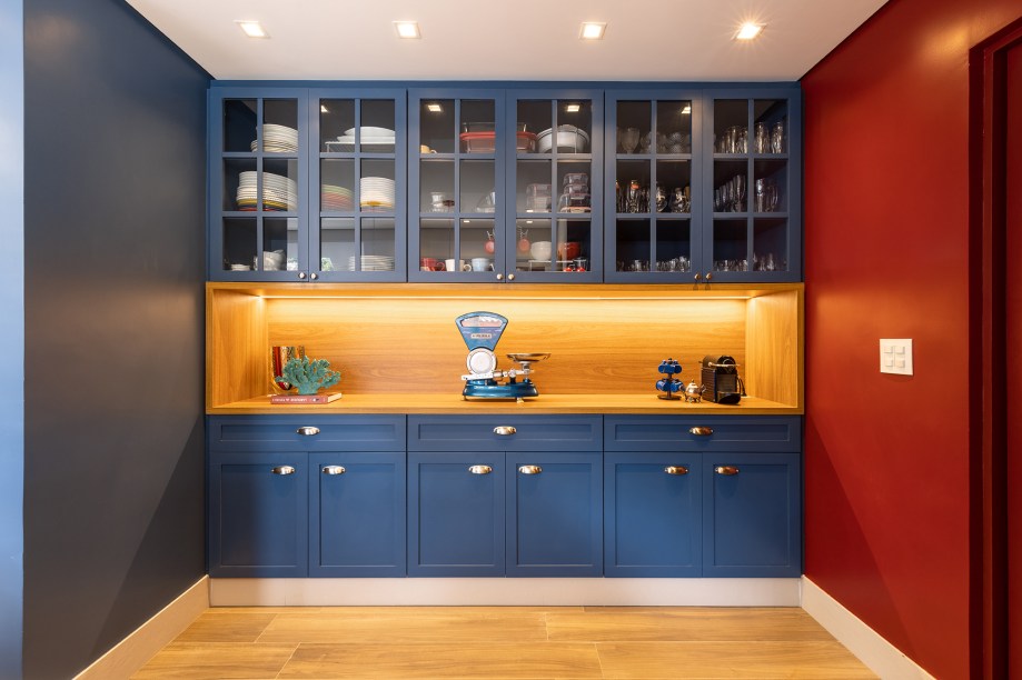 “Criamos um grande armário com nicho para guardar toda a louça e objetos decorativos. Nesse mesmo espaço, continuando com bancada de porcelanato da cozinha, fizemos uma mesa de apoio para refeições, onde se pode observar as vistas – externa da natureza e interna da bela cozinha”, dizem as profissionais.