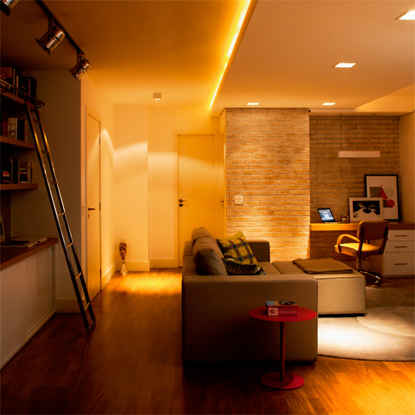 A iluminação foi a peça-chave para o arquiteto paulista Tomas Zaidan definir quatro ambientes num só espaço de 4 x 6 m: estar, jantar, biblioteca e escritório. Num dos trechos da sala, ele manteve parte da parede de tijolinho recuada 50 cm, onde encaixou a bancada do home ofice e investiu em claridade difusa. Não queria gerar calor e desconforto. “A luz nunca deve incidir no usuário, mas no que ele está vendo”, ensina o profissional.