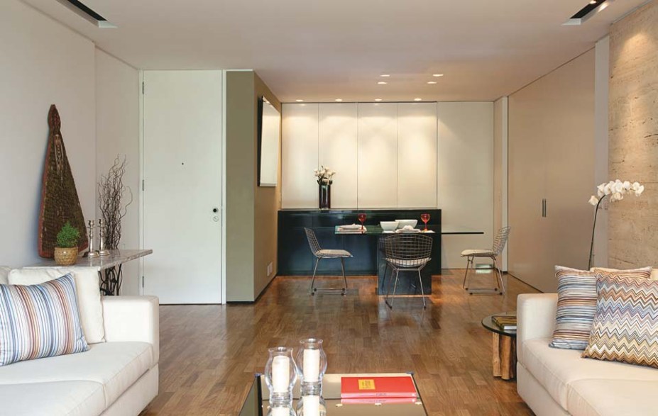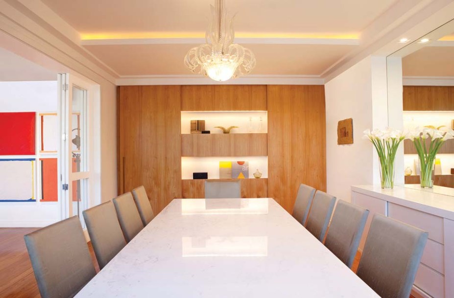 Na sala, a iluminação tem de ser flexível, com diversos tipos de luz para atender de festas e jantares a atividades mais tranquilas como ler. “A indireta, mais intimista, é boa para quem vai ouvir música. Já a geral clareia o espaço de forma homogênea”, explica o lighting designer Guinter Parschalk, do Studio Ix, em São Paulo. Quanto aos equipamentos, melhor optar por luminárias neutras, com design limpo ou em tons discretos – a exemplo das peças embutidas em sancas ou rebaixos de teto. Para a leitura, basta um abajur ou uma coluna de piso, com foco direto. Na área de jantar, cabem aos pendentes trazer a luminosidade para baixo. Para compor cenários românticos ou festivos, aposte na dimerização. “As halógenas ou as incandescentes oferecem variação de luz e de temperatura de cor”, completa.
