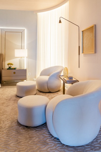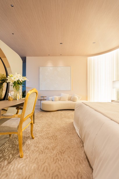 A sala de estar é conectada ao jantar, possibilitando que os usuários de ambos os ambientes se conectem e desfrutem de momentos especiais. Já no quarto, separado por uma parede curva que reforça a leveza da proposta, o conforto aparece da roupa de cama à tapeçaria. No teto, para proporcionar ainda mais aconchego e equilíbrio, o papel de parede mimetiza madeira.