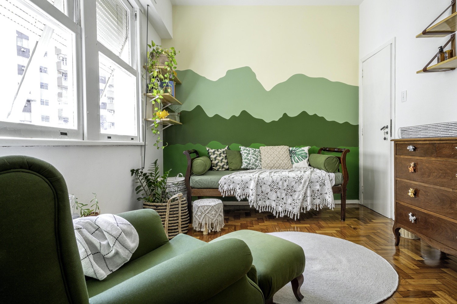 Chama a atenção também a pintura da parede em tons de verde. As ondas assimétricas remetem ao horizonte de um conjunto de montanhas, pintadas à mão livre pela designer de interiores. Esse desenho traduz o pedido especial dos pais, que desejavam um quarto inspirado nas florestas.