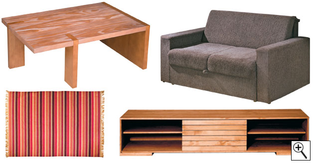 Conjunto PP – 7,50 m² – R$ 1 345Dupla função – O compacto Karina II (1,53 x 0,95 x 0,81 m*) pode ser usado como sofá ou cama. É revestido de gobelim e tem estrutura de pínus. Casas Bahia, R$ 499.Cores poderosas – com listras em tons terrosos, o tapete Kappucino (2 x 2,50 m), de fio de algodão tingido, dá aconchego a qualquer ambiente. Tok & Stok, R$ 299.Mesinha assimétrica – a graça da mesa de centro Astúria (75 x 50,2 x 30 cm) está nos pés irregulares. O acabamento é escovado e a peça é vendida no padrão caramelo ou tabaco. Meu Móvel de Madeira , R$ 197,10 (ou 10 x R$ 21,90).Estrutura funcional – de madeira maciça, o rack Cru (1,20 x 0,45 x 0,60 m) oferece uma porta e quatro prateleiras que favorecem a organização. Beity Design, R$ 350 (ou 10 x R$ 39,90).