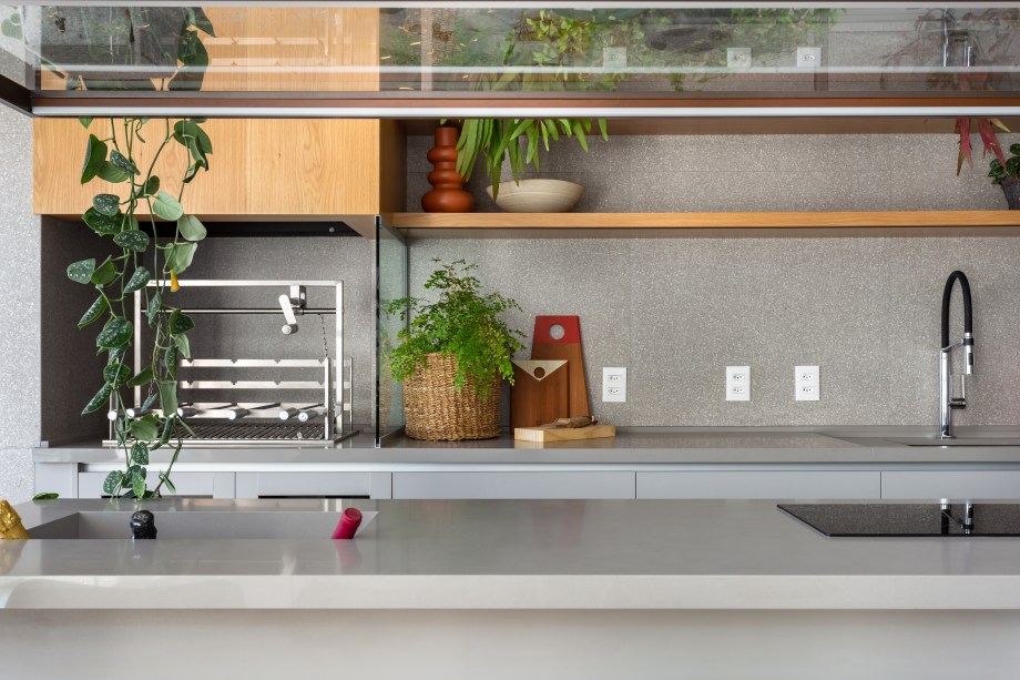 Para executar a conexão com o ambiente, no projeto a seguir as arquitetas do Studio Tan-gram propuseram uma ilha composta por uma bancada para refeições rápidas, armários e um louceiro na parte superior.