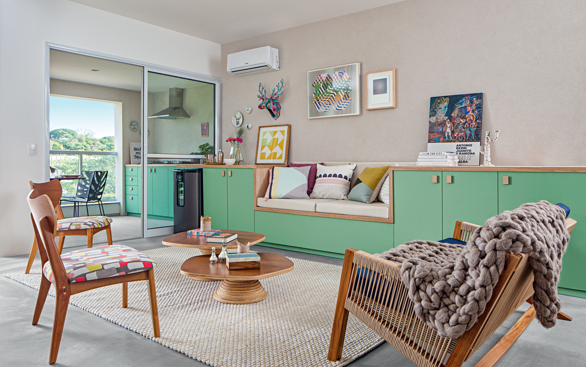 O móvel verde-água é armário e sofá ao mesmo tempo, uma ótima saída para quem precisa criar espaços de armazenamento. “O colorido da marcenaria, junto com as almofadas e as obras, confere personalidade e descontração ao apartamento”, diz a arquiteta. A Cervejeira Consul ganhou um nicho só dela no móvel e contribui para a ideia de continuidade dos ambientes. Na sala ou na varanda, é possível buscar bebidas geladas sem perder nada do happy hour com os amigos.