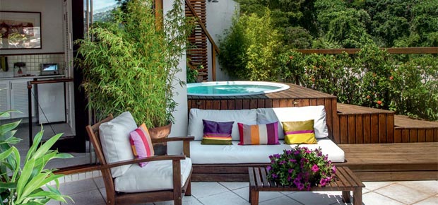 Artista plástica carioca ergue uma charmosa varanda repleta de plantas na varanda de seu apartamento de cobertura: o espaço conta com deque, sofás, piscina e até horta