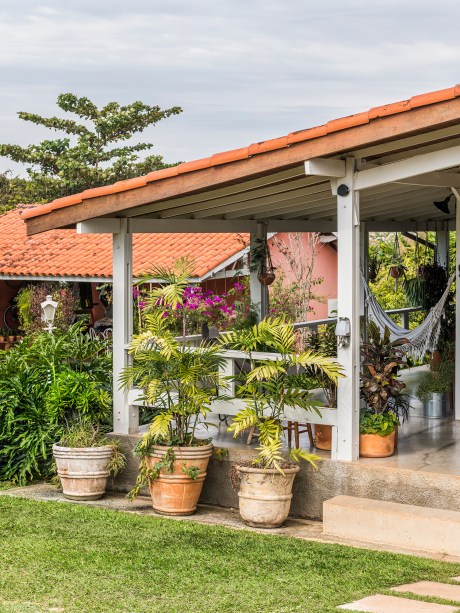 O aconchego das madeiras naturais recuperadas e os detalhes em branco são complementados pelo paisagismo, também assinado pelo escritório. A opção por vasos e pendentes na varanda, assim como grandes folhagens tropicais no quintal e contorno da casa trarão privacidade e conforto térmico à residência.