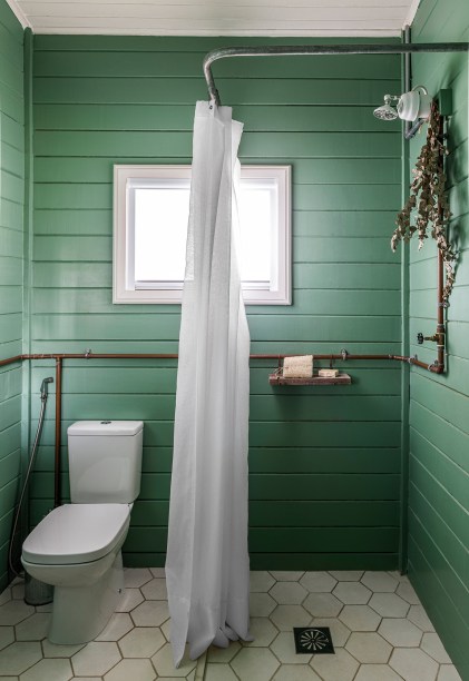 Os banheiros seguem a linha garimpo rústico industrial, com cubas feitas em bacia de cobre, encanamento de cobre nas tubulações de água e gás e ferro galvanizado para eletricidade. Nas bancadas, madeira de demolição e aço.