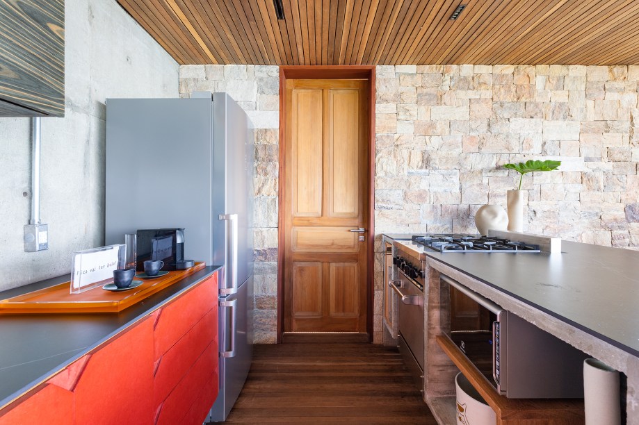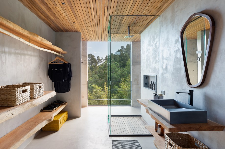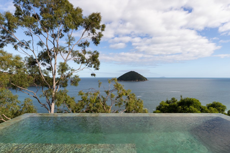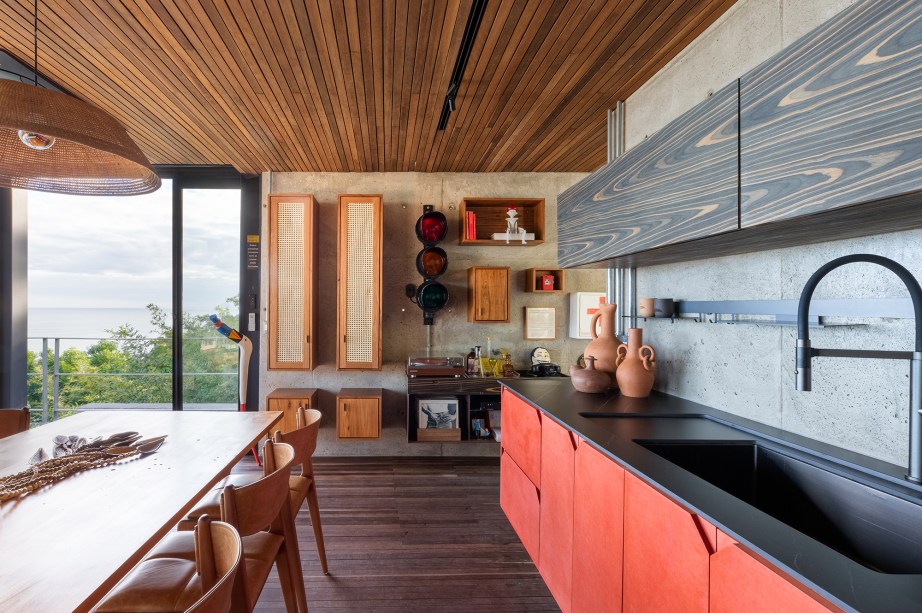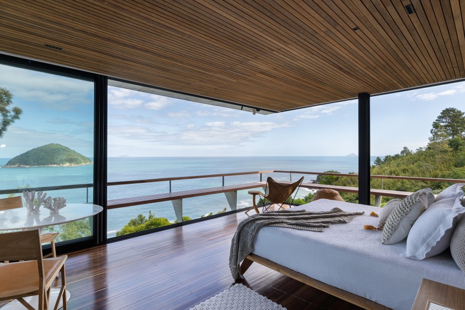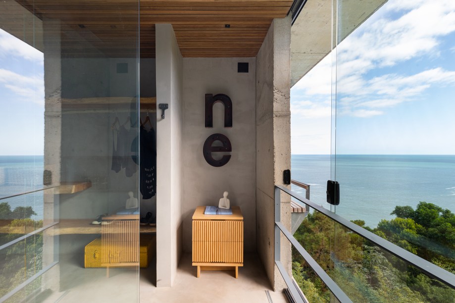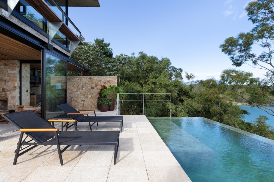 “Optamos em utilizar pilares e vigas metálicos galvanizados a fogo, o que permitiu as generosas aberturas das esquadrias e os balanços estruturais“, explica o escritório. Destaque para a piscina com fundo infinito de frente para o oceano e instalada a mais de 60 m de altura do nível do mar, como se estivesse flutuando sob a copa das árvores em uma estrutura de grandes pilotis.