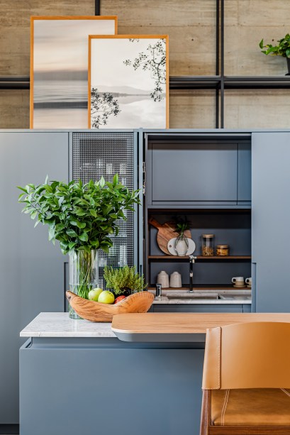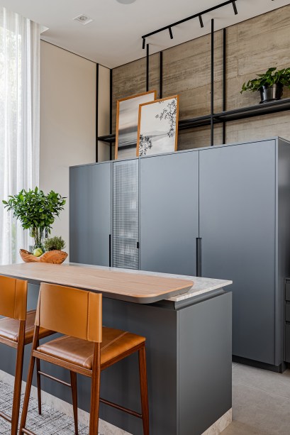 Os armários da copa possuem portas que, quando fechadas, se camuflam na marcenaria do escritório. Estruturas metálicas criam prateleiras em vários pontos e expõem peças de decoração e materiais de trabalho. O pé-direito alto aumenta a sensação de amplitude.