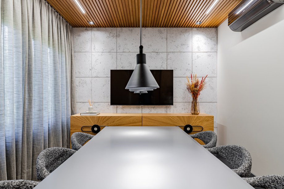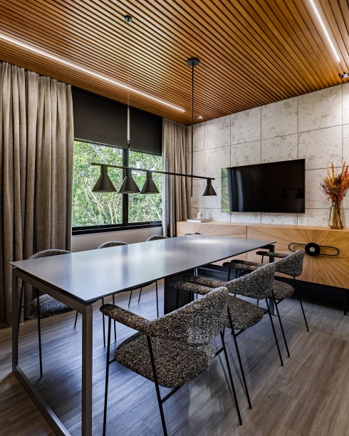 A sala de reuniões é composta por um aparador solto desenhado exclusivamente para o projeto, mesa e poltronas.