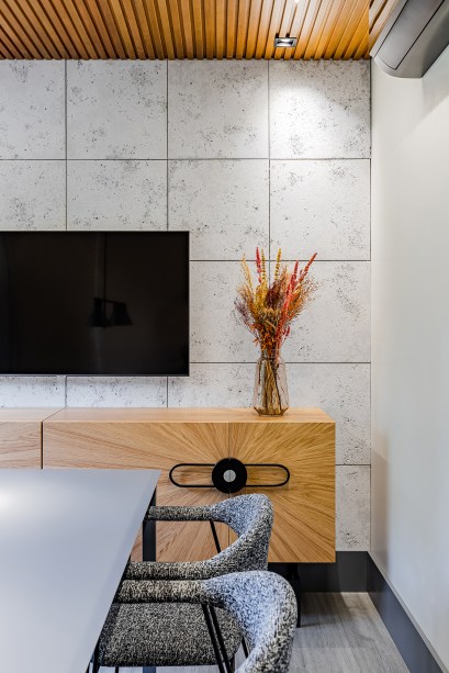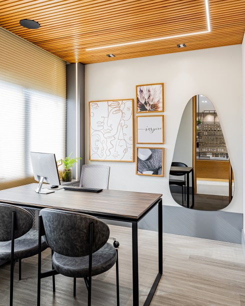 No segundo volume, mais intimista, concentram-se uma sala de atendimento rápido, espaço de reuniões e um lavabo. A divisão dos programas se dá por um painel revestido com lâmina natural de madeira e portas na mesma linguagem.