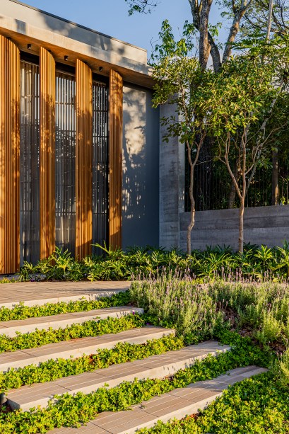 A entrada se dá por uma grande porta ripada de madeira, que fica ao lado um painel de vidro com brises móveis feitas de ripas em um modelo asa de avião. A solução permite a incidência de luz natural nesse primeiro espaço, onde funciona o estar, a copa e as estações de trabalho.