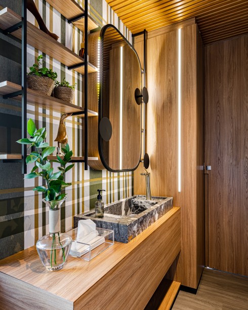 Já no lavabo, a proposta foi utilizar um tecido na parede, que impacta a todos assim que entram. O espaço também possui mobiliário e forro em tons amadeirados.