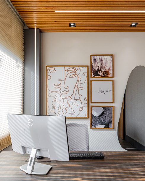 Uma composição de quadros e um espelho de formato orgânico vestem as paredes da sala de atendimento rápido. No teto, o ripado da fachada se repete.