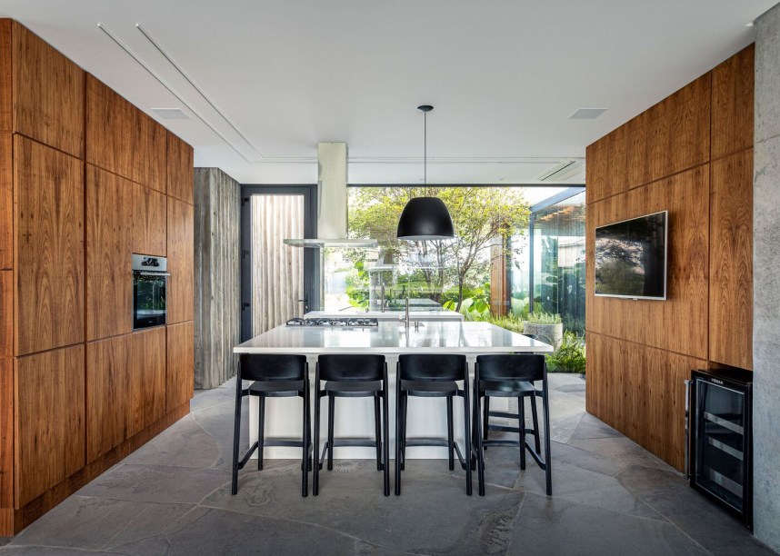 No térreo, todos os caminhos levam às ensolaradas varandas do grande living, com cozinha integrada, e da suíte principal, que se abrem sobre o pátio e a piscina.