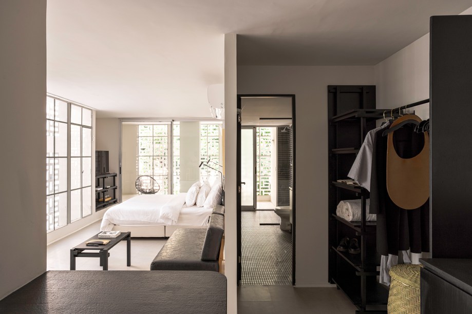 Retrofit de prédio no centro de SP vence Monocle Design Awards 2024. Projeto de Metro Arquitetos. Na foto, quarto com parede de cobogó e cama de casal.