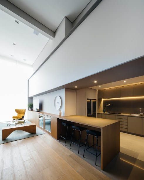 O grande diferencial do projeto e destaque foi a forma como a arquitetura compõe e setoriza os ambiente. Quatro caixas programáticas e cromáticas criam cenas dentro do apê, que é beneficiado por um generoso pé-direito duplo.