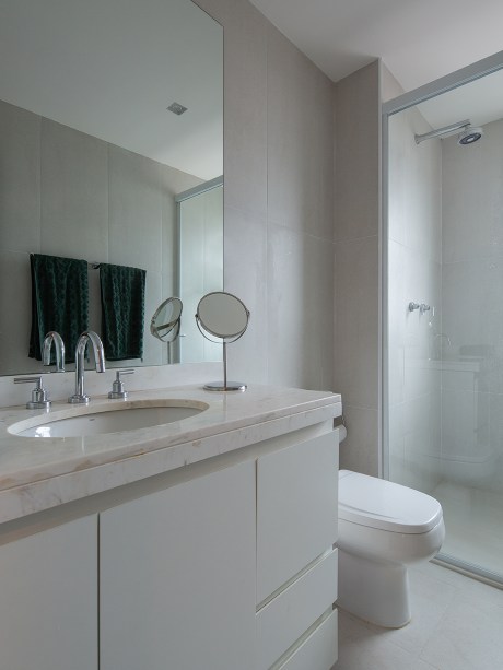 A primeira caixa é composta pelo hall de entrada e acesso ao lavabo. A cor rubi destaca esse espaço, que funciona como um intervalo entre dentro e fora do apartamento. “Em frente ao elevador, expusemos a coleção de miniaturas holandesas do casal, para que logo na entrada, exista essa conexão com a memória afetiva da família”, explica Flavio Castro, à frente do escritório.