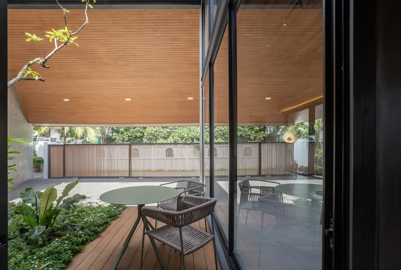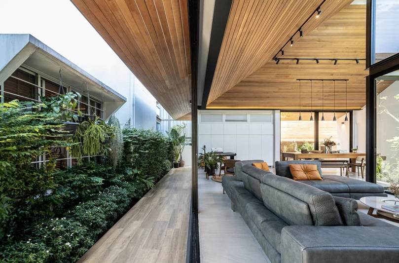 Com 256 m², o espaço incorpora um pátio central como ponto focal, cujo teto moderno possui uma abertura no meio, que traz luz natural e ar para dentro da residência, permitindo que uma árvore existente cresça livremente.