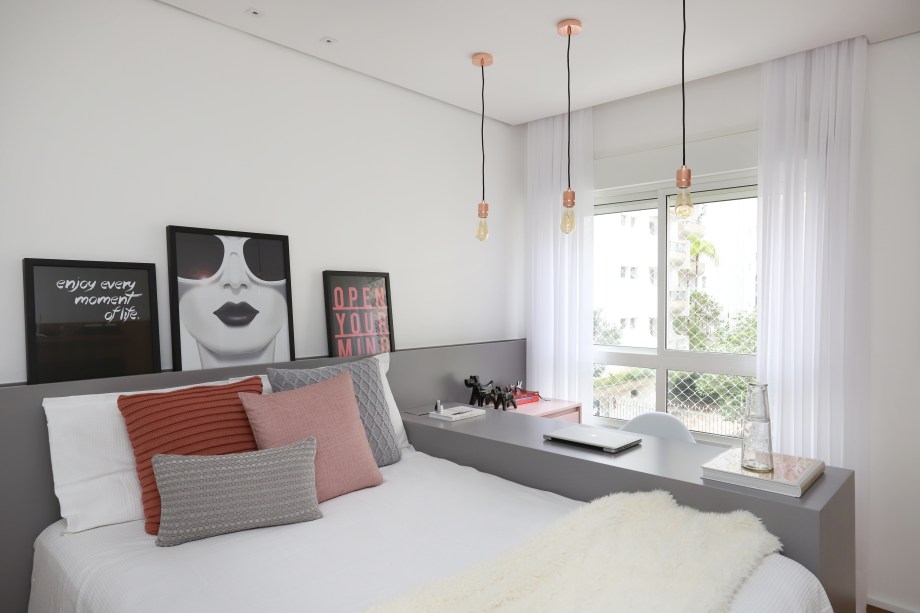 Na suíte master, a cabeceira foi desenhada para servir também de apoio para quadros. Destaca-se também a parede de tijolinhos, que recebeu pintura branca e o toque azul nos apoios laterais. O neon “Love” é um objeto especial para a moradora, que o comprou em uma de suas viagens a Nova York.