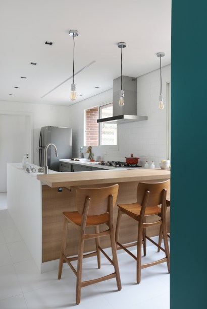A cozinha, um dos ambientes preferidos dos moradores, recebeu atenção especial. Ampla e iluminada, ela ganhou uma bancada de corian curva, acompanhada pela marcenaria. Esse detalhe conferiu um ar de continuidade ao ambiente. Entre outros detalhes interessantes, há um balcão para refeições rápidas, parede de lousa, horta e um armário sem porta colorido, que deixa os utensílios à mão.