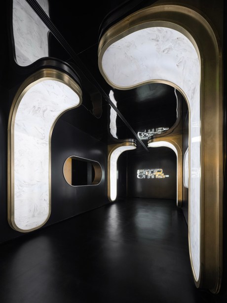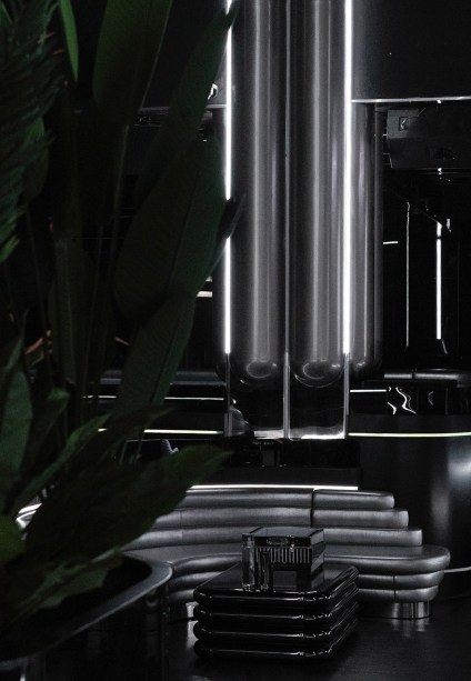 Revestimentos de pedra, acabamentos espelhados, tintas, aço inoxidável e couro são combinados, gerando um contraste visual distinto. O preto é dominante em vários tons, enquanto as curvas orgânicas com formas simples, porém abstratas, quebram composições horizontais e verticais e redefinem a estética clássica.