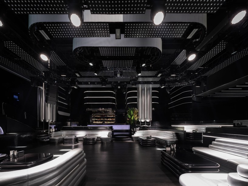Com inspiração nos teatros gregos, a balada construída em tons de preto permite uma visão ampla de todo o espaço