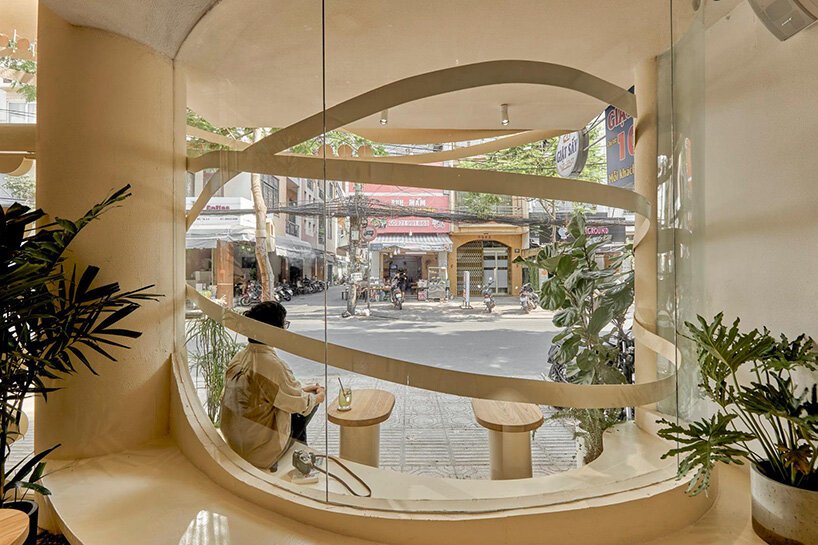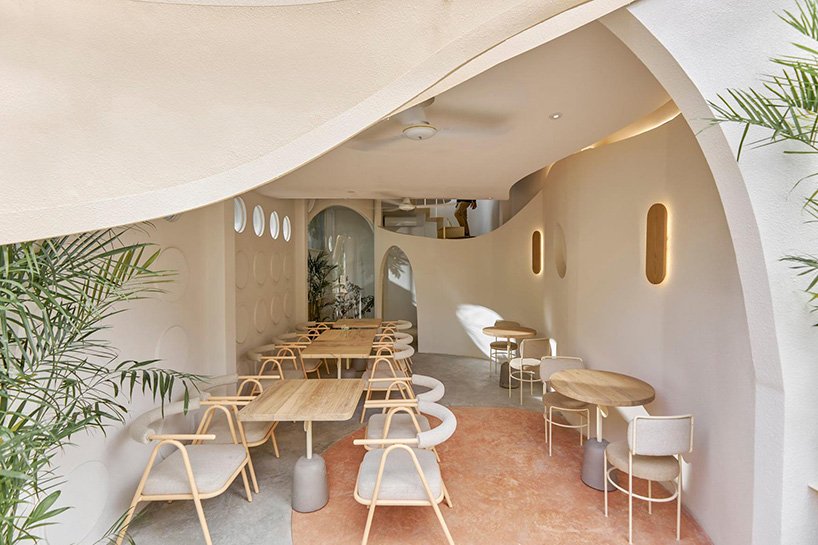 Cores neutras e suaves – como branco, bege e rosa-laranja – cobrem as paredes, móveis e o teto. Produzindo um sentimento que lembra uma brisa se espalhando pelos cantos do café, o Red5studio construiu o interior com arcos, aberturas redondas e escadas circulares.