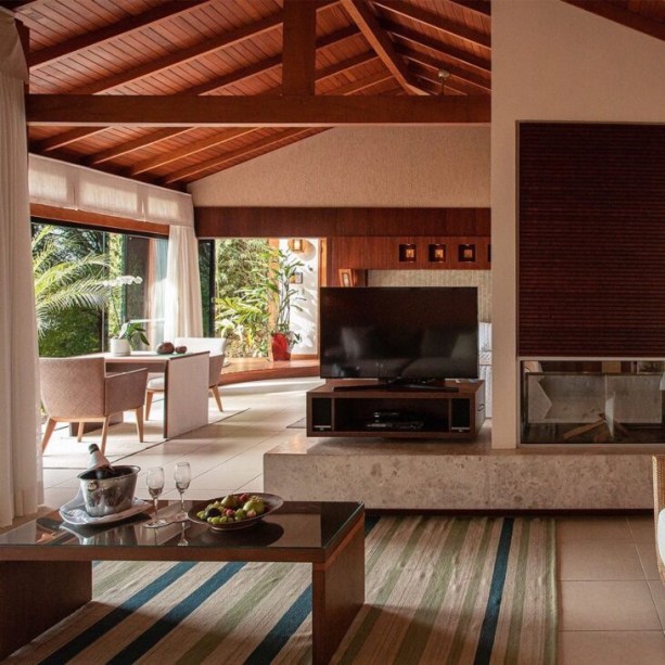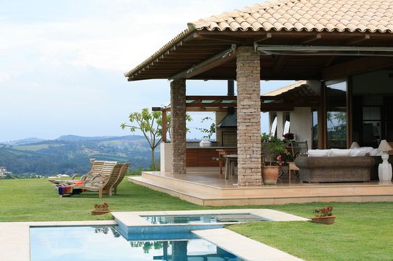 Outra característica marcante das casas de campo são os ambientes amplos e integrados para uma boa reunião em família ou entre amigos. Varandas e piscinas também são super bem vindos.