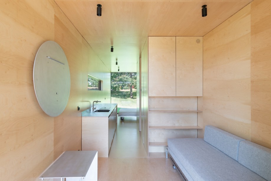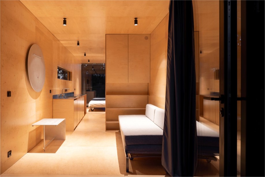 Enquanto isso, todos os componentes internos foram projetados individualmente para a cabine. Dentro da estrutura de metal, encontra-se um acabamento de madeira compensada natural quente. O espaço de 23 m² conta com dois quartos, uma sala, uma cozinha e um banheiro. Esta função extensa foi possibilitada por móveis transformáveis. Já a porta de vidro, é dobrável e abre em toda a largura, e o interior se expande para um terraço ao ar livre com vista para o lago.