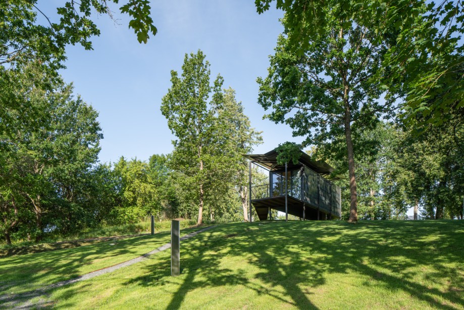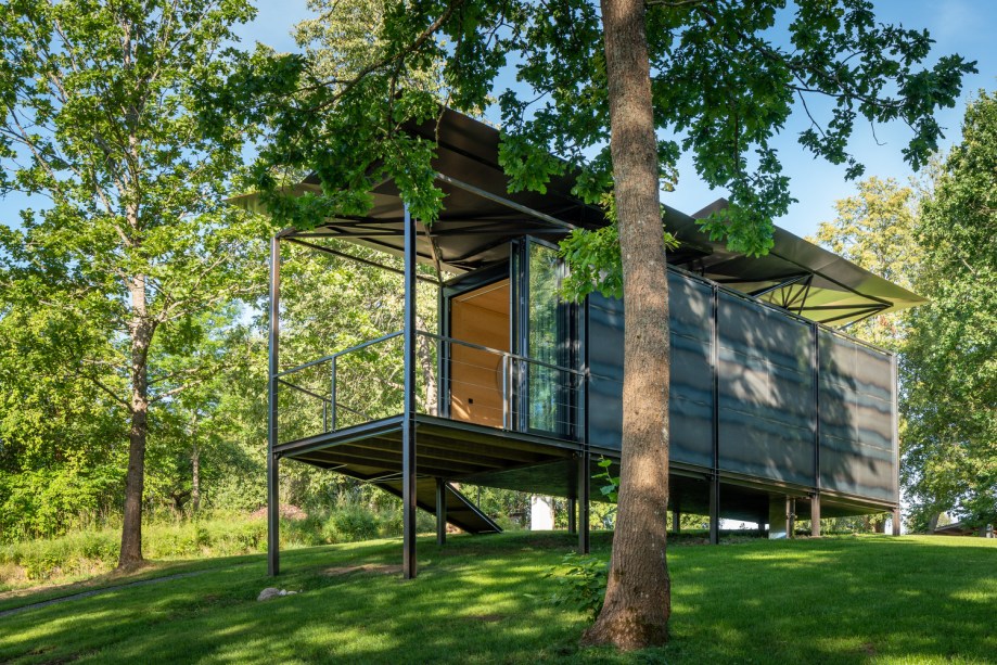 A casa se adapta ao terreno natural por estar apoiada em pernas esguias, de alturas variáveis. O metal utilizado na construção e fachada é incolor, deixando um padrão único criado durante seu processo de fabricação. Portanto, todas as cabines modulares têm gráficos de fachada ligeiramente diferentes.
