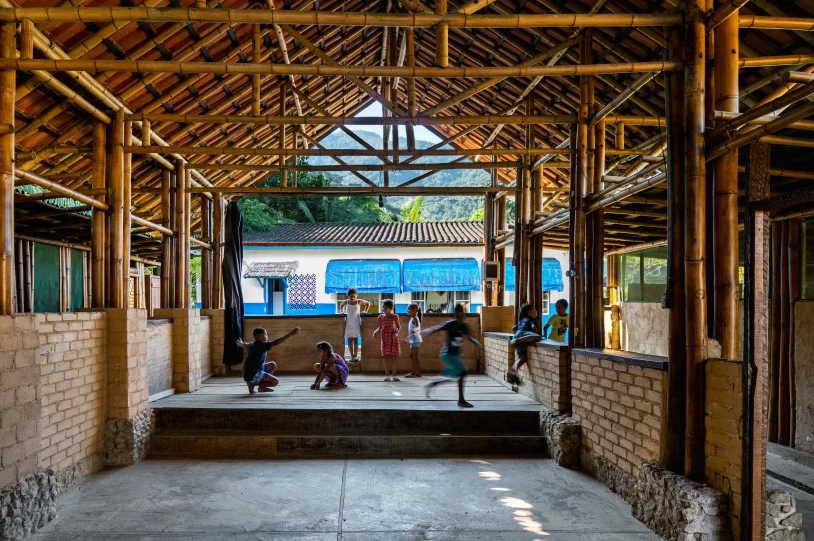 O escritório de arquitetura CRU!, junto à comunidade, planejou e construiu o centro social a partir do uso de bambu