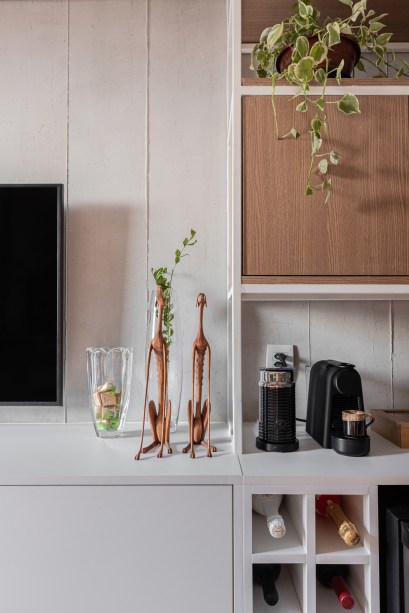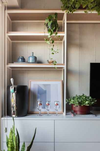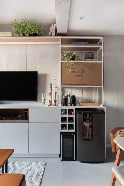 O mobiliário, aliás, delimita e desenha a área de circulação da área social. De um lado, a estante, feita de marcenaria e serralheria, foi pensada para ser um elemento de visual leve e com nichos para armazenar os equipamentos de TV, uma cervejeira, adega, chopeira, máquina de gelo e cafeteira.