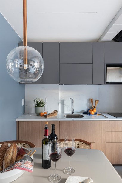 Quando o jovem casal de moradores contatou as arquitetas Gabriella Chiarelli e Marianna Resende, do escritório Lez Arquitetura, logo pediram que o novo apartamento tivesse espaço para encaixar todos os equipamentos e móveis que eles faziam questão de ter. Localizado na região do Guará, em Brasília, o imóvel é um apartamento dúplex, de apenas 44 m² e foi um desafio para as profissionais encaixarem tudo por lá. “Eles adoram cozinhar e receber os amigos em casa e nos pediram para repensar todos os ambientes”, conta Gabriella.