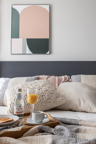 Para criar uma atmosfera aconchegante e com um toque contemporâneo, as profissionais escolheram madeira e uma paleta baseada no cinza e fendi, que se espalham pela marcenaria, o mobiliário solto e acessórios que complementam o décor.