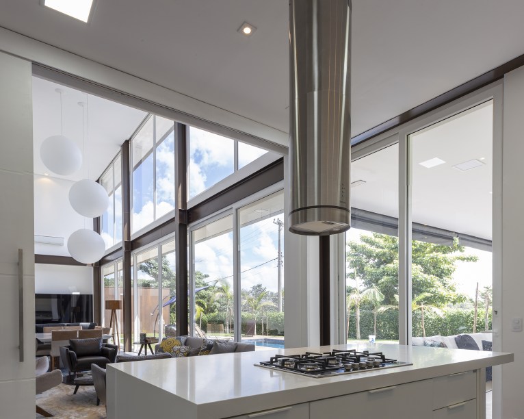 Na face noroeste da casa, foi criada uma cortina de vidros especiais, capazes de bloquear em 70% os raios UV. Além deles, os quadros de PVC proporcionam um desempenho termoacústico superior aos demais materiais. Assim, a entrada de luz natural é generosa, mas o máximo de calor é dissipado.