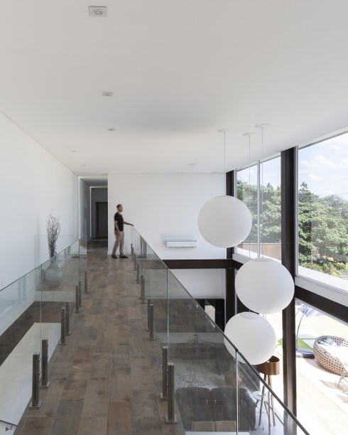 O uso destas estruturas possibilitou a obtenção de um grande vão livre com pé direito duplo na área social, com 14 m de comprimento, e a passarela de ligação entre as áreas íntimas, que conecta a escada com os dormitórios.