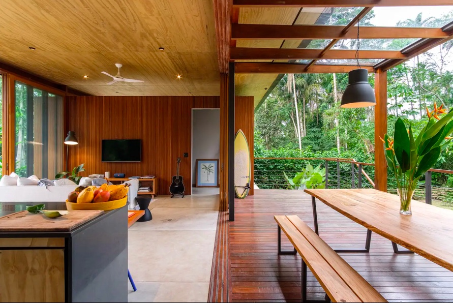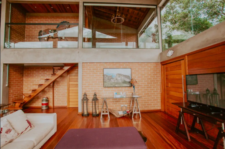 Localizada no bairro da Ressaca, em Ubatuba, a acomodação se destaca pela privacidade, com pouca vizinhança e segurança 24 horas. Apesar de ser afastada da praia, proporciona contato com a natureza. A residência é sustentável, produzindo sua própria energia, e dispõe de uma decoração típica da região do litoral, com muita madeira.