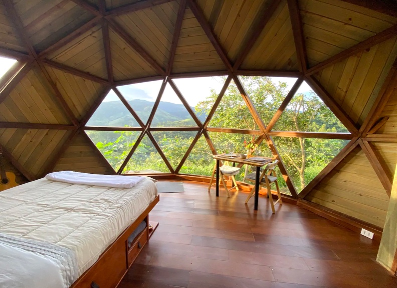 Localizado na região da Serra da Mantiqueira, este domo geodésico é uma opção para quem busca uma hospedagem rústica e diferente. Para apreciar ainda mais o cenário local, um painel de vidro enquadra tudo no quarto.