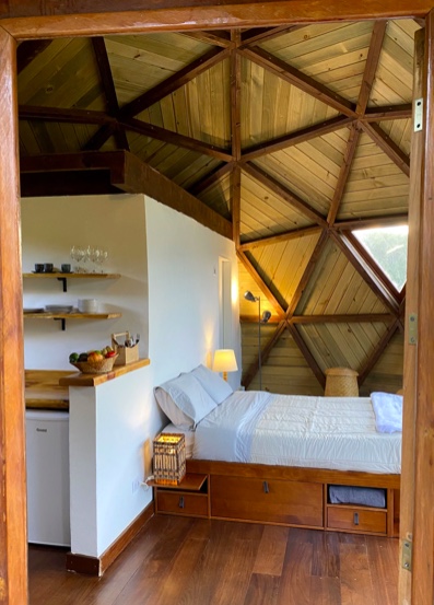 A estrutura de design diferenciada é resistente e leve, projetada 100% em madeira ecologicamente tratada. À noite, um show de céu estrelado é apresentado pelos vidros do espaço principal e, para uma maior privacidade, cortinas foram adicionadas.