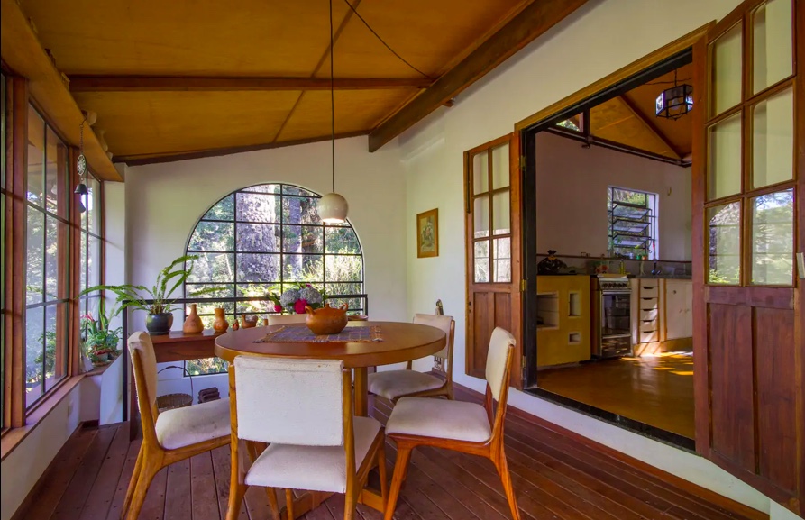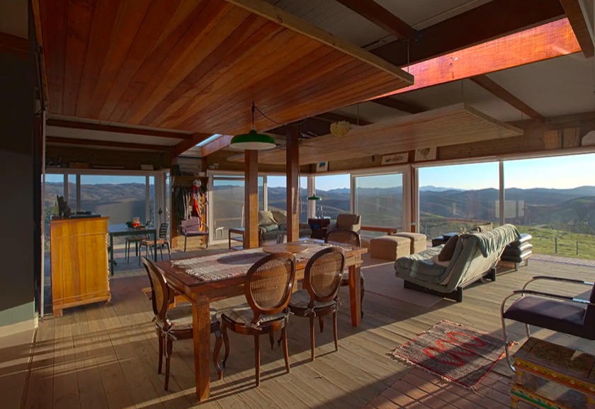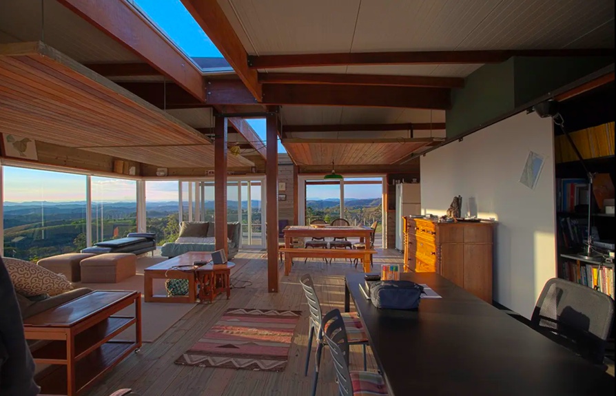 A vista panorâmica desta residência vai te encantar! Além de poder fazer uso da horta, pomar, agroflorestal e galinheiro, o espaço é dedicado para o convívio, estudo e leitura. Cinco Cantos foi arquitetado para receber muita luz natural e manter a conexão entre os hóspedes e a natureza mesmo dentro do espaço.