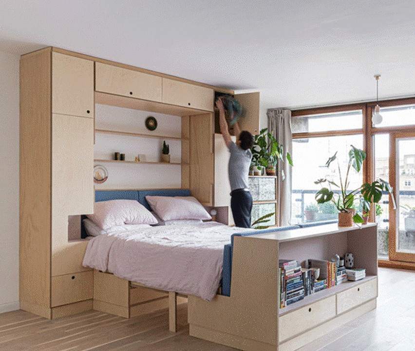 Com pouca área disponível, o desafio era criar ambientes para comer e dormir, mas também dar ao morador o espaço de que precisava para praticar a sua coreografia. O estúdio britânico fez isso desenvolvendo uma peça multifuncional de mobília de compensado que pode assumir várias configurações.