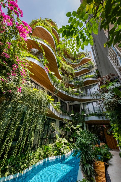 Exuberantes plantas tropicais caem das varandas onduladas desse edifício, criando uma fachada verde que oferece ar fresco e uma atmosfera relaxante. O grande vazio no terreno de 320 m² apresenta uma piscina curva onde os visitantes podem mergulhar em um ambiente tranquilo.