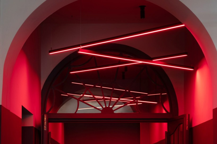 Em todo Blauer Stern, as luzes neon funcionam como iluminação e instalações de arte abstrata. Além disso, fazem referência ao letreiro pendurado do lado de fora, sinalizando a atração, e foram usadas para traçar uma abertura em arco entre o corredor e o próprio auditório – tomando conta de todo o interior do edifício.