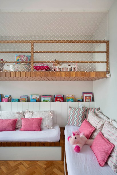 “Projetamos uma plataforma suspensa em marcenaria, com acesso por uma escada tipo marinheiro que fica guardada no closet. Assim a mãe pode controlar o uso do espaço, caso queira impedir o acesso das meninas por questões de segurança”, explicam as arquitetas.
